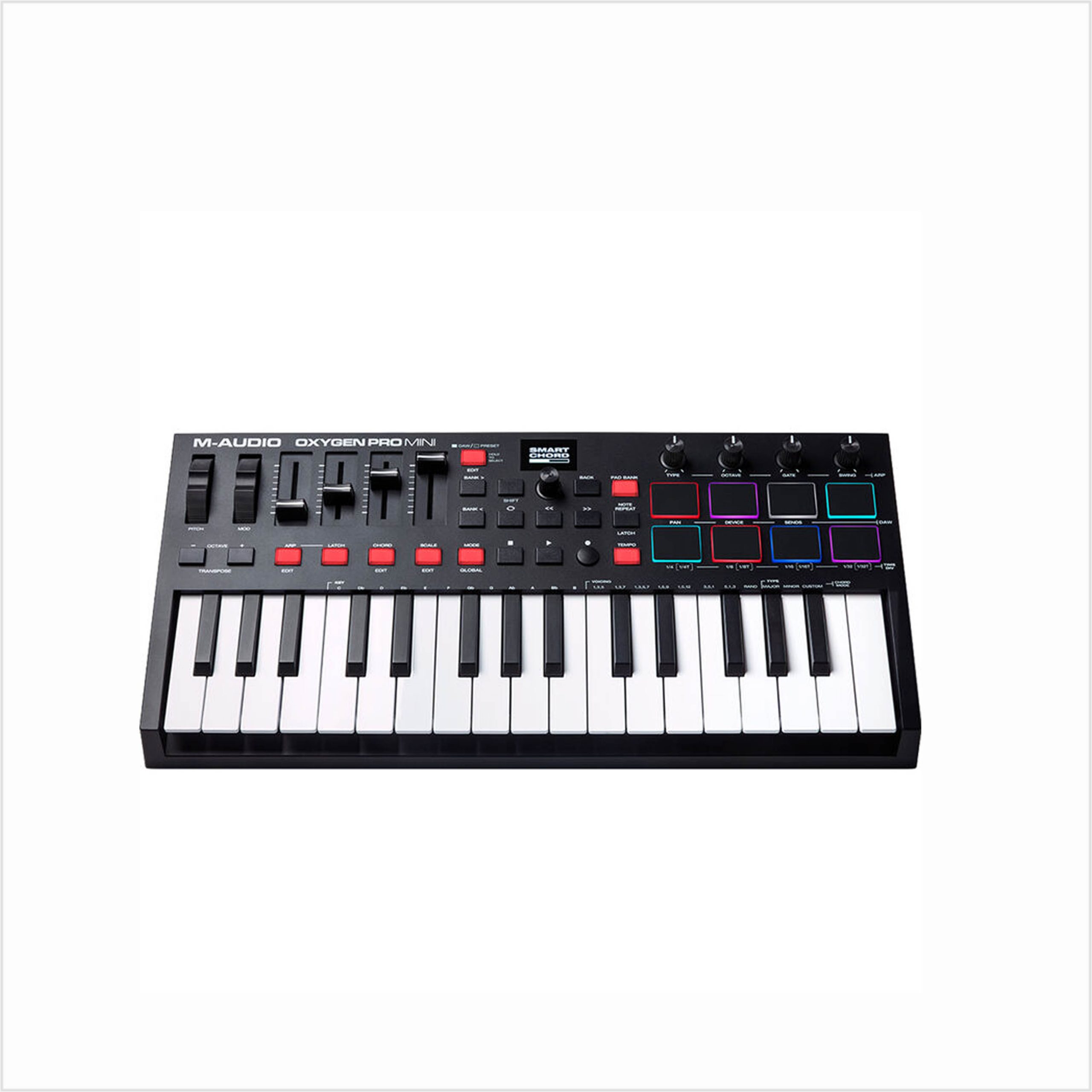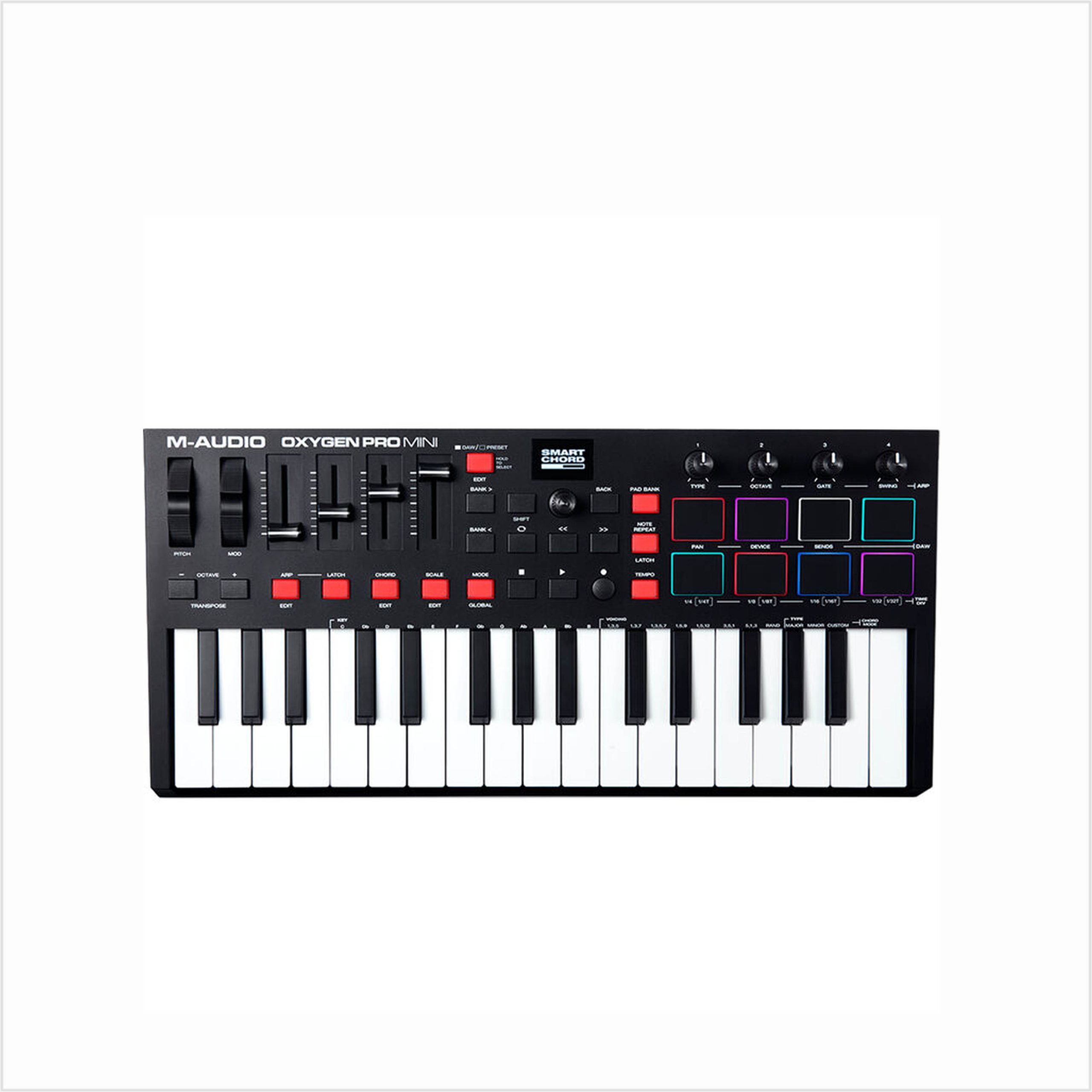 Diseñado para productores profesionales y beatmakers móviles, el M-Audio Oxygen Pro Mini es un teclado controlador MIDI USB portátil que combina 32 miniteclas semicontrapesadas sensibles a la velocidad con un hardware de control versátil, mapeo automático, tecnología Smart Chord y Smart Scale, y un arpegiador. Además, incluye un paquete de software creativo (que incluye un editor MIDI, DAWs e instrumentos virtuales), lo que permite crear música al instante en el escenario o en el estudio.